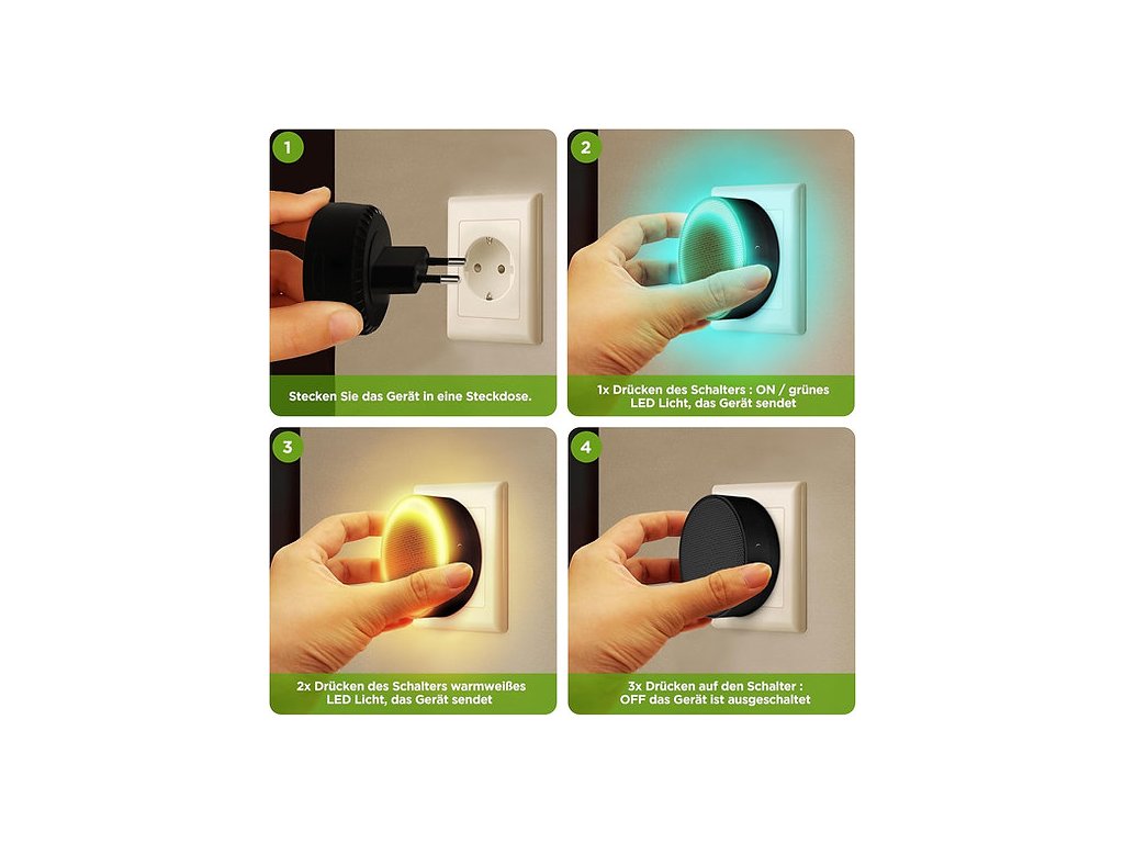 Zariadenie jednoducho zapojíte do zásuvky a začne okamžite vysielať impulzy v 3-sekundových intervaloch. Nepoužíva žiadne chemikálie, a preto neohrozuje deti, domácich miláčikov ani životné prostredie. Vstavaný vypínač a orientačné svetlo uľahčujú používanie najmä v tmavých miestnostiach.