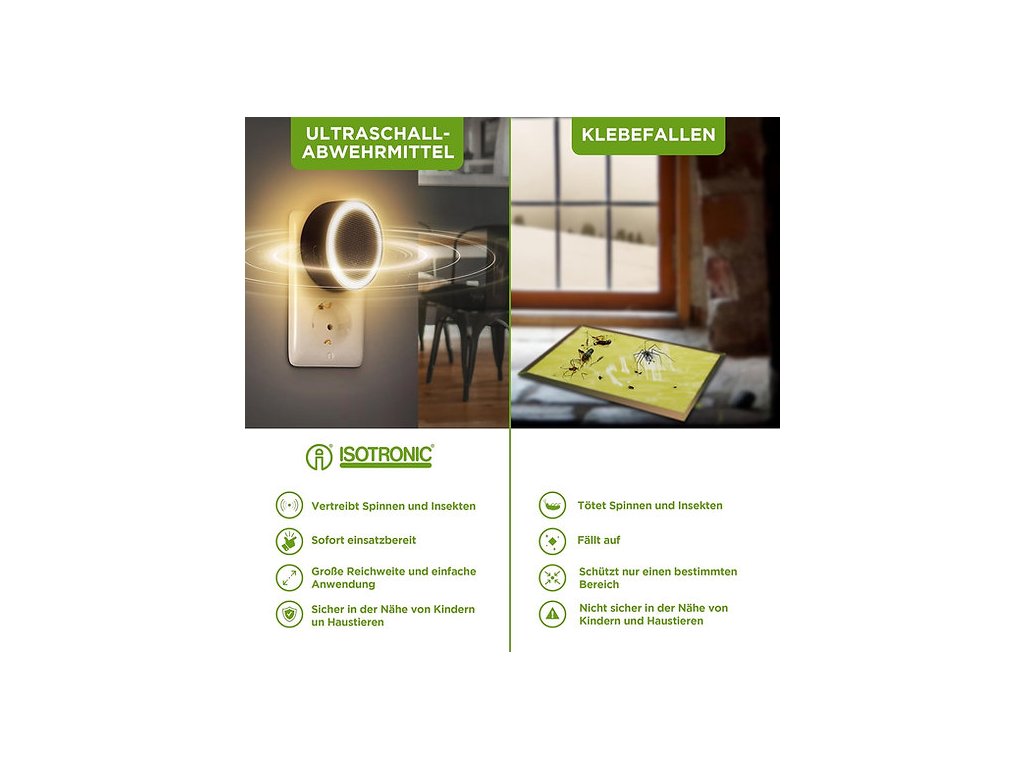 Pavúky a hmyz často lezú tam, kde ich najmenej chcete – do pivníc, garáží, podkroví alebo špajzí. ISOTRONIC odpudzovač pavúkov a hmyzu ich udrží mimo vášho priestoru pomocou ultrazvukových tónov, ktoré vnímajú ako rušivé a nepríjemné. Vďaka meniacim sa frekvenciám si na zvuk nezvyknú, čo zaručuje dlhodobý účinok.