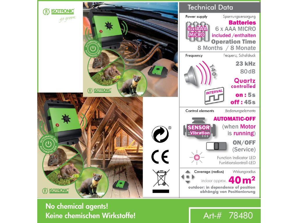 Plašič ISOTRONIC je moderné riešenie pre každého, kto chce ochrániť svoj domov, auto alebo sklad pred nepozvanými hosťami, ako sú kuny a myši. Zariadenie vydáva vysokofrekvenčné zvuky, ktoré sú pre škodcov nepríjemné, ale pre ľudí nepočuteľné. Funguje výhradne na batérie, takže ho môžete použiť kdekoľvek – bez montáže a káblov.