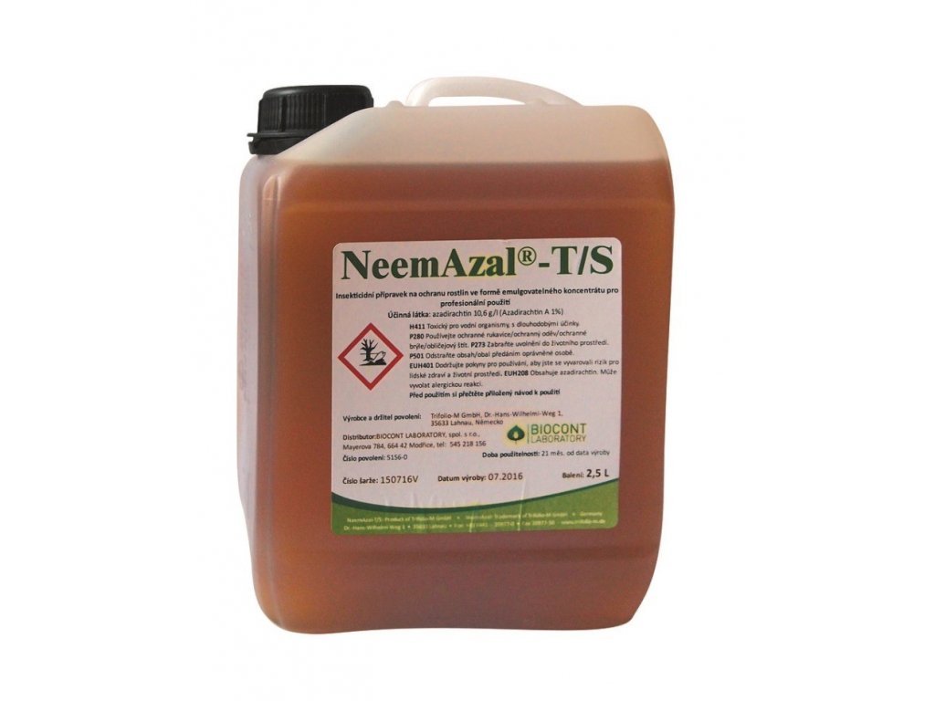 - Údaje o prípadných škodlivých účinkoch prípravku NeemAzal-T/S na rastliny odpovedajú skúsenostiam z bežných podmienok praxe a sú nezáväzné. Nepreberáme zodpovednosť za riziko po aplikácii.