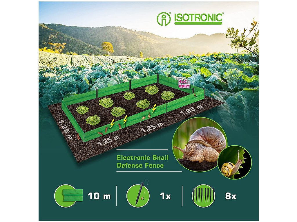 ISOTRONIC elektronický ochranný plot pomáha ochrániť úrodu bez chémie a škodlivých látok. Udržujte svoju záhradu bezpečnú a zbavte sa slimákov humánne a efektívne!
